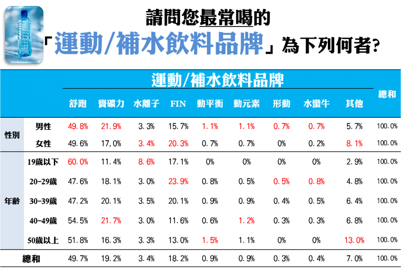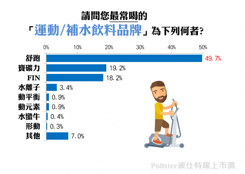 Pollster波仕特線上市調網詢問「請問您最常喝的運動/補水飲料品牌為下列何者?」。調查結果顯示以「舒跑」占壓倒性多數,占整體受訪者之49.7%,「寶礦力」與「FIN」分別以19.2%與18.2%位居第二與第三,再其次則依序為「水離子」3.4%、「動平衡」0.9%與「動元素」0.9%,民眾最常喝「運動/補水飲料品牌」之前三名分別為「舒跑」、「寶礦力」與「FIN」。