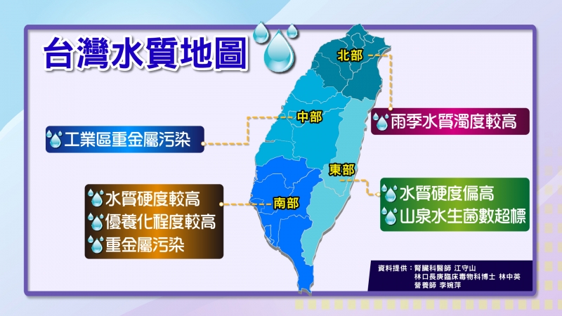 台灣水質地圖大公開!你家可能有哪些水質問題?選擇淨水器原來也要「因地制宜」,不同區域、不同水質,適合不同功能的淨水器。原來喝水可以護腎,甚至效果更勝人蔘?!怎麼喝、喝多少?請專家告訴你!
