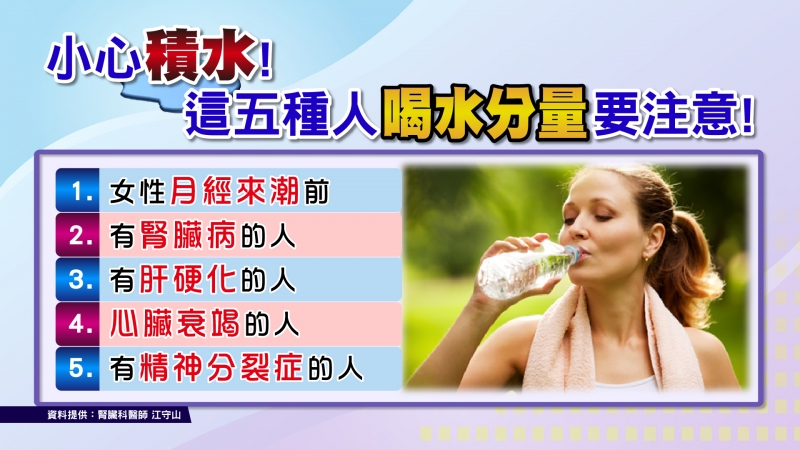 腎臟科醫師江守山說明,飲水量需彈性減少的5大容易積水族群,包括: