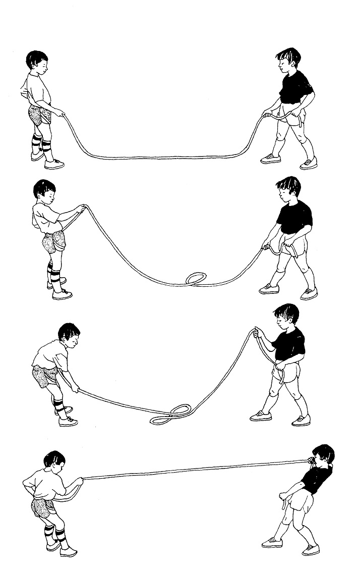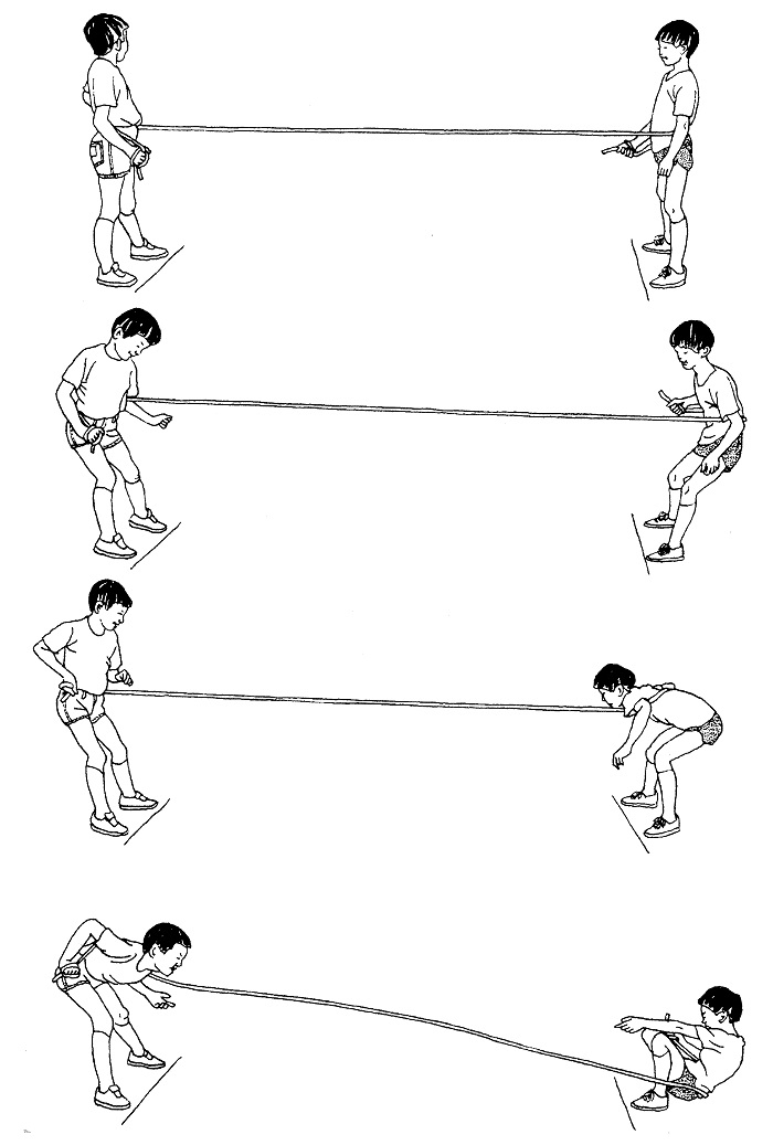 用一根繩子互相拔河。雙方之間的距離約三公尺。