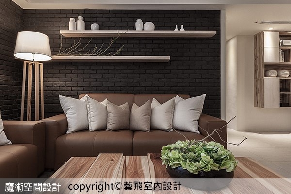 2.【圖說】客廳以深色文化石鋪陳沙發背牆,淺色木層板擺設飾品,呈現簡單自然調性。