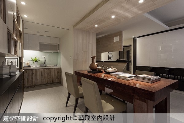 4.【圖說】餐廳從天花連貫而下的裝飾板,隔絕客衛出入口的隱藏門,也讓空間產生聚焦亮點。