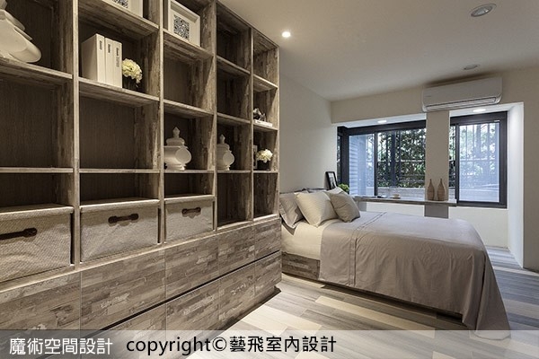 9.【圖說】臥房以斑駁木紋為主視覺,展示收納櫃、床架、邊桌檯面,均展現與地板相呼應的木質紋理。