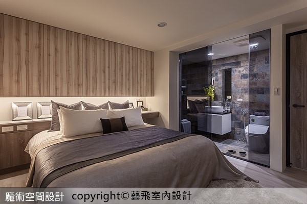 11.【圖說】臥房主牆運用風化木作整體設計,融合視覺效果與收納機能,衛浴採用木紋磚呼應。