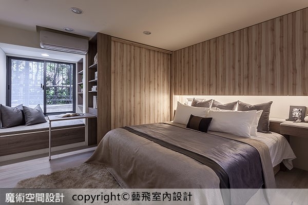 8.臥房以斑駁木紋為主視覺,床側依靠立柱設計加長型檯面式邊桌,取代床頭櫃置物功能,並可作為閱讀桌使用。