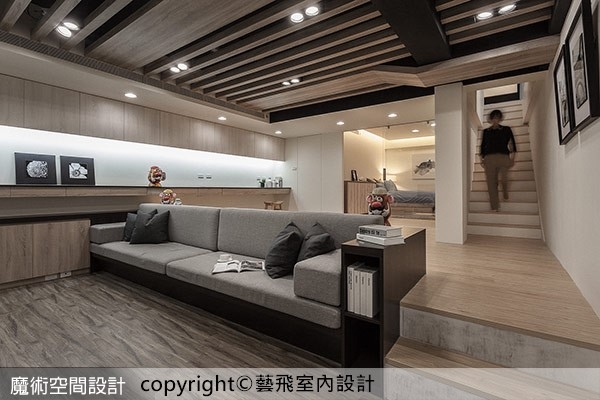 13.【圖說】藝飛室內設計將原先位於地下室的公用書房,改造成下沉式起居室,藉由高低差區分場域功能。