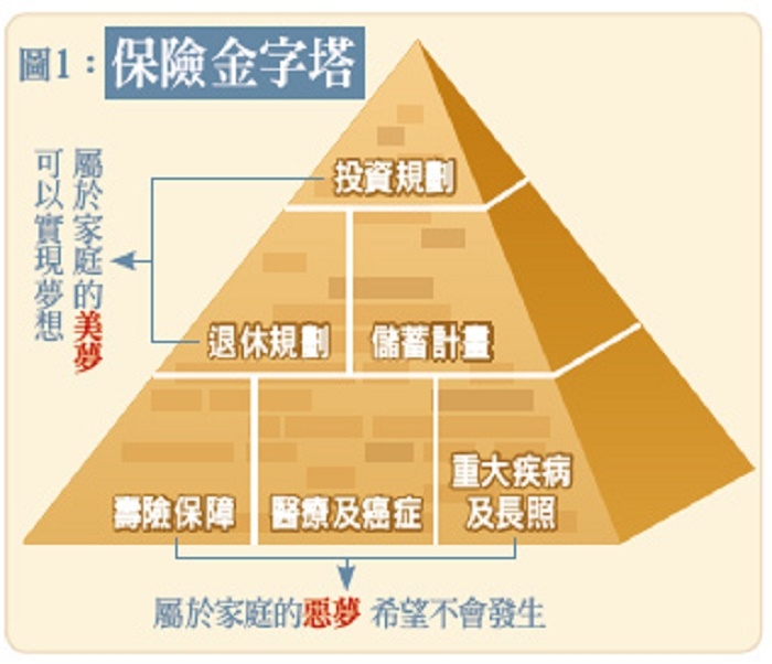 保險的需求項目依其重要性大致可歸納為一個保險金字塔,底層需先滿足壽險、醫療及癌症險、重大疾病與長期照護的基礎保障,再依不同的階段目標進行退休儲蓄計畫,例如:結婚基金、購屋基金、子女教育基金、出國旅遊基金、退休金。最後,配合經濟景氣,選擇適合的投資工具累積財富並予以傳承。