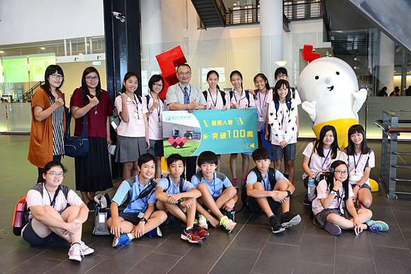 國美館迎接今年第一百萬名觀眾,蕭宗煌館長與開心與幸運觀眾-新竹縣成功國中師生合影留念