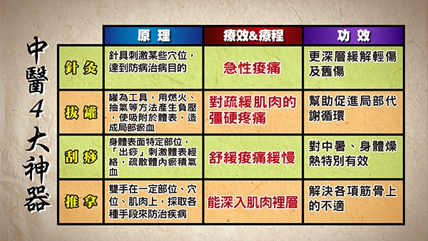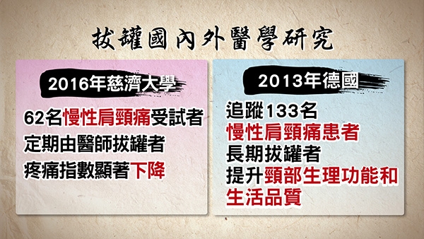 中醫師陳潮宗介紹,拔罐治療歷史悠久,最早在春秋戰國時期,就有人以獸角當拔罐器,到了隋唐時期,開始用竹筒,主要的功能是吸血排膿。明清之後,發明了小陶罐,成為拔罐的主要工具。拔罐法,古代典籍中亦稱“角法。古代醫家,多以動物的角作為吸拔工具。在1973年湖南長沙馬王堆漢墓出土的帛書《五十二病方》中,就已經有關於角法治病的記述。表明古代醫家至少在公元前6~公元前2世紀,已經採用拔罐這一治療方法。爾後,拔罐療法不斷發展、延伸,因其器材及拔罐方式變化,又有“吸筒療法”、“火罐氣”之稱。拔罐以玻璃跟塑膠罐為主,玻璃罐用在脂肪較厚或肌肉範圍較大的地方,先用火烤或將罐內空氣抽掉,讓罐吸附在皮膚或穴位上,產生溫熱刺激,使被拔部位出現充血、瘀血,像風濕痛、腰背痛或扭傷可拔罐腰背,風寒咳嗽則可拔罐背部脊椎左右側的俞穴。拔罐原理是藉火燒或抽氣,造成局部真空,牽拉罐子底下的神經、肌肉、血管以及皮下腺體,引起一系列神經內分泌反應。首先,負壓作用使局部迅速充血、淤血,小毛細血管破裂,紅血球破壞,發生溶血現象,釋放出血紅蛋白、組織胺、5-羥色胺和多類神經介質。這一連串的反應會激活多項免疫機制,增加人體抵抗力。人體的免疫系統就像軍隊,拔罐就像一次漢光演習,固定操練才能培育出精兵悍將!