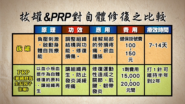 復健科醫師周適偉說明:拔罐和PRP兩個都是以血來作治療,生長因子PRP注射:直接啟動受傷子PRP的修護功能,注射一個月後疼痛部分,則宜追加量劑。