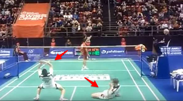 最後紅方一個跳殺,讓白隊的選手防守不及整個都呈現跪姿了!不過更誇張的是他竟然跪著還能跟對方耗上幾球啊!!