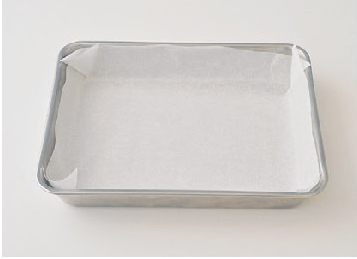 ※烘焙紙裁剪成符合烤盤底部與四周立起高度的大小,並在 4 個角剪出切口後鋪好。