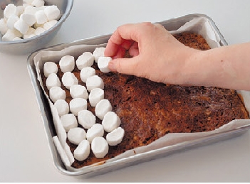 ※布朗尼放涼後比較好吃,所以等變涼後放上棉花糖再烤一次。