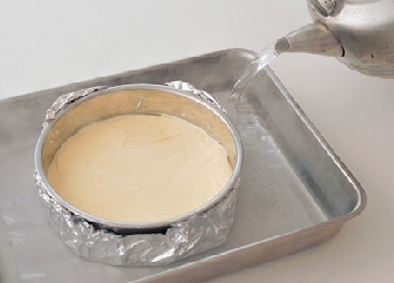※ 倒入熱水,以隔水加熱烘烤。在烤盤上鋪烘焙紙是為了降低受熱。