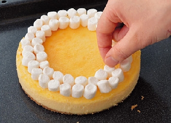 6 烤箱先預熱至 210 度。拿出冷藏過的蛋糕,將刀子插入烤模和蛋糕間繞一圈脫模(保留底板),並擺滿棉花糖。然後,放入烤箱中烤 3~5 分鐘,表面呈現金黃色後取出,放涼後分切即可。