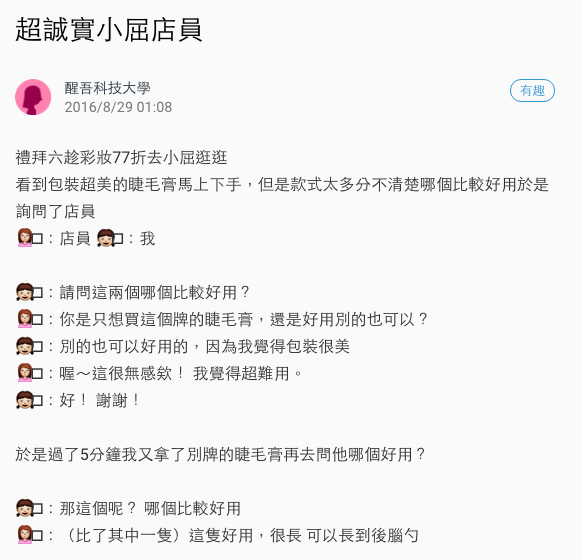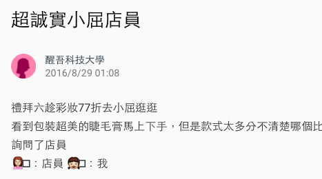 有位網友在Dcard上就分享了一位小屈店員超好心的指點她哪樣商品好用,