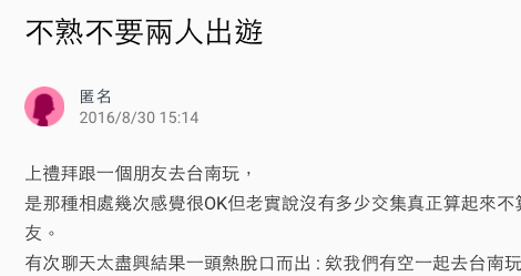 po文中提到在一次的聊天中隨興的答應了一位不太熟的朋友一起出遊,