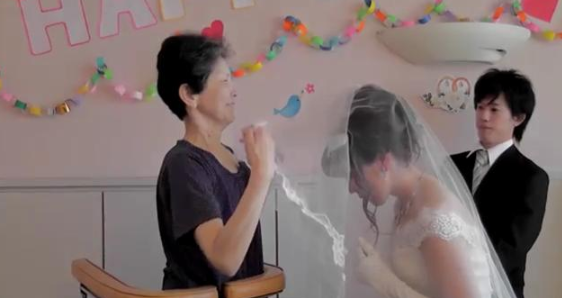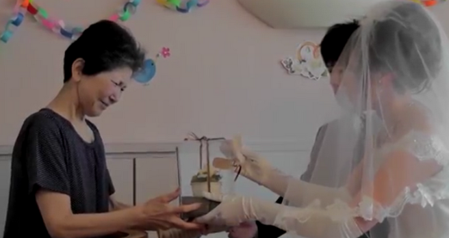 可以看到女兒的婚紗真的太好了!就這樣,在病房裡開始了的結婚典禮。.新郎對母親的握手誓言。「我會一生守護著您的女兒,請您安心」,向母親這樣發誓。