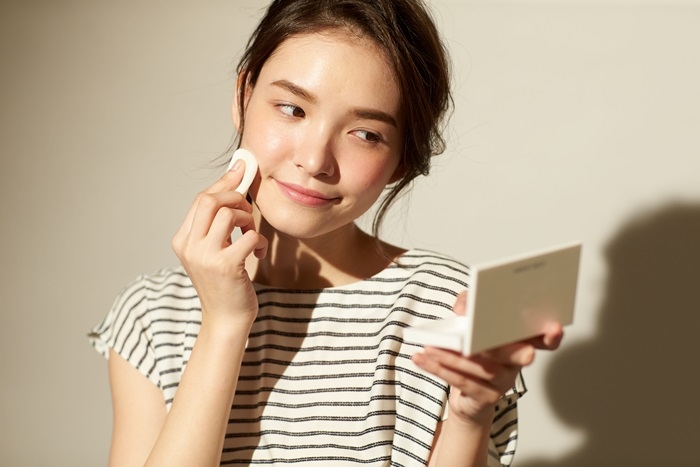中午只要外出買飯,一回到室內絕對會滿頭大汗,臉上多少都有脫妝現象,一到下午就會發現臉上的妝容變得很黯沉,這時候就要進行補妝,建議選用具防曬的底妝品以及涼感的彩妝色系,讓整體妝容煥然一新。