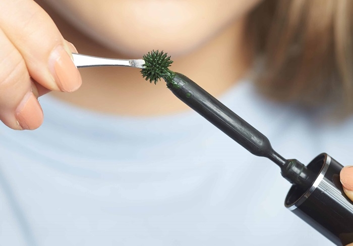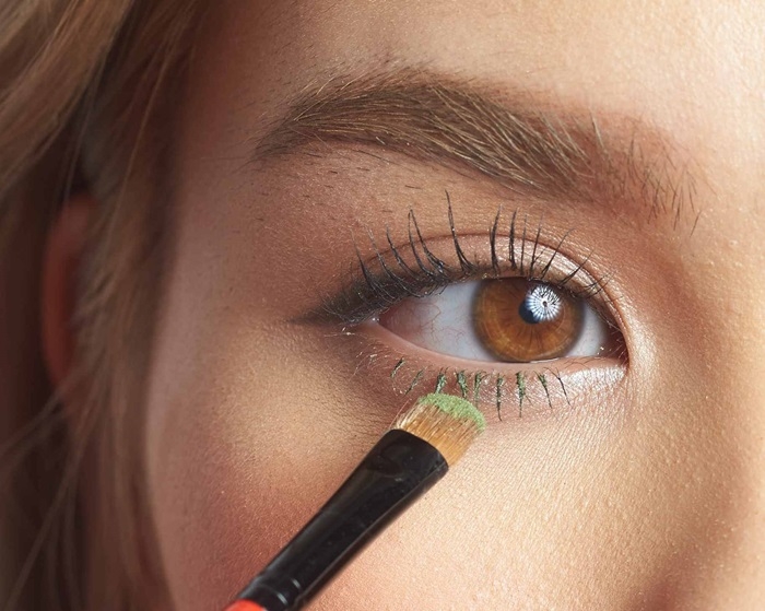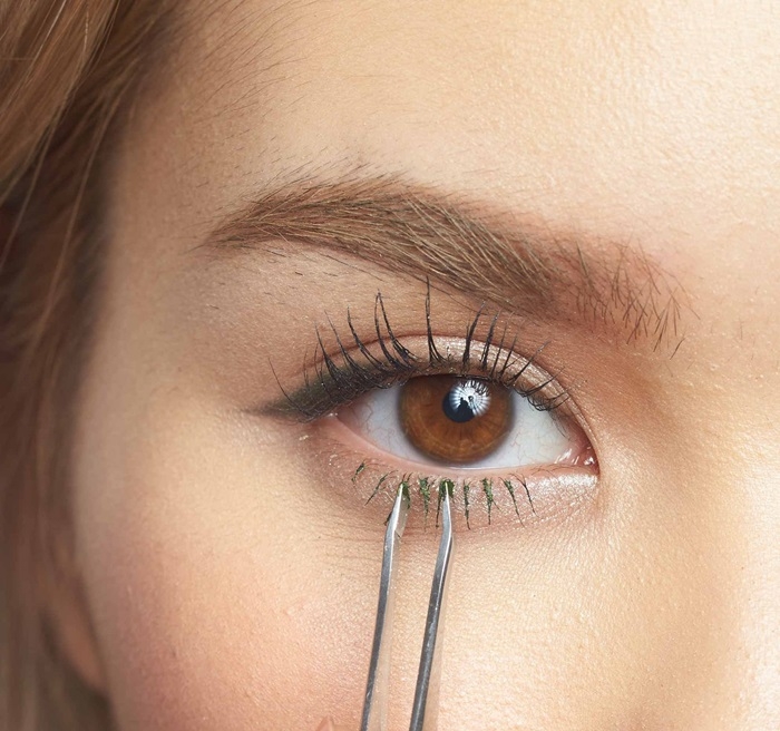塗刷下睫毛時,為了預防睫毛結塊,此時可先用鑷子沾取綠色睫毛膏。