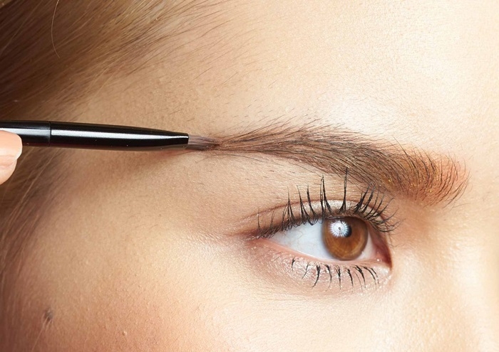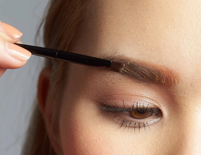 再使用眉刷頭沾取深咖啡色,描繪眉尾形狀、更加深尾端色澤,讓眉型更具立體感!