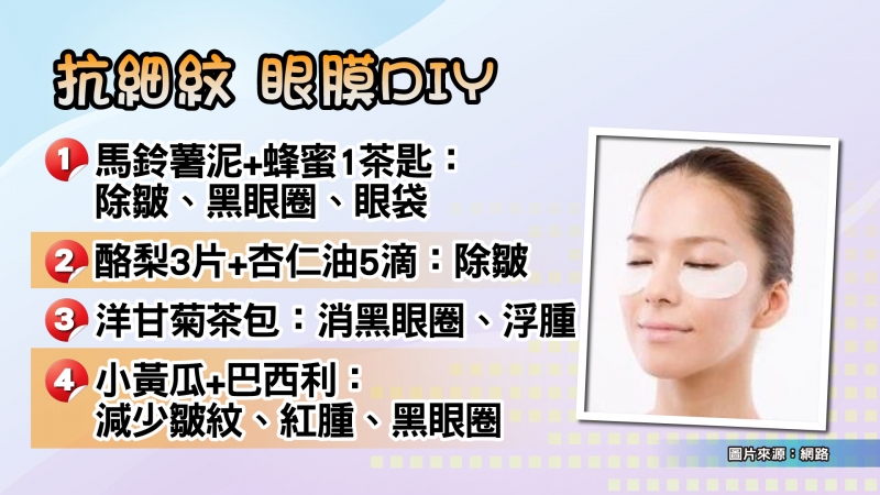 酪梨油非常容易被皮膚吸收,相對於杏仁油,玉米油,橄欖油及大豆油,酪梨油的皮膚滲透率最高。有絕佳的保濕滋潤效果,能保持皮膚的細緻與柔軟,適合極為乾繰的肌膚使用。洋甘菊茶包:消黑眼圈、浮腫能幫忙消除眼睛水腫,以及因熬夜引起的暫時性黑眼圈。小黃瓜+巴西利:減少皺紋、紅腫、黑眼圈