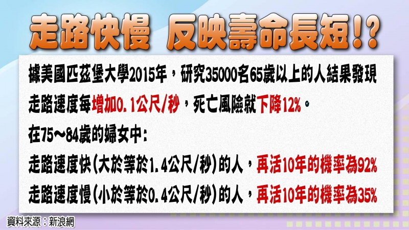 據2015年美國匹茲堡大學一項研究發現,走路快慢可預測壽命長短。研究3萬5千名65歲以上的人結果發現,走路速度每增加0.1公尺/秒,死亡風險就下降12%。比如,在75—84歲的老年婦女中,走路 最快(速度大於等於1.4公尺/秒)的老人再活10年的幾率為92%,而走路最慢(速度小於等於0.4公尺/秒)的老人再活10年的幾率僅為35%。研究負責人斯蒂芬妮·斯圖登斯基博士表示,走路速度直接反映出一個人的活力,因為走路涉及到身體諸多器官和系統,如心臟、肺臟、肌肉、關節、骨骼和大腦等。她認為,走路速度將成為醫生在診斷過程中判斷患者體質的重要依據之一,速度慢意味着患者可能存在健康問題,有必要採取措施改善血壓、飲食以及鍛煉等健康因素。