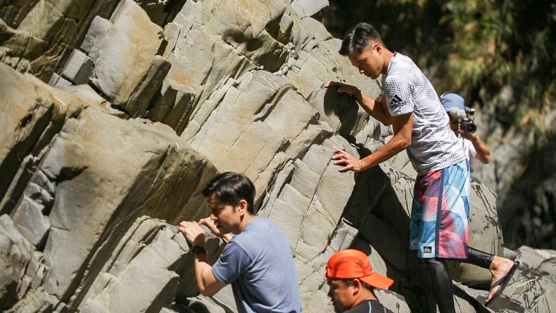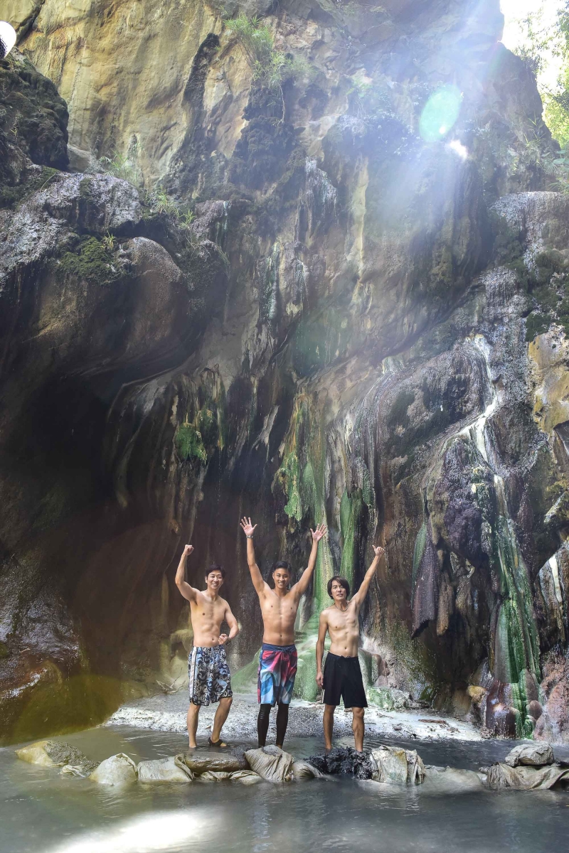 抵達之後,三人迫不及待要去體驗,孫其君說:「溫泉通常是從地底冒出來的,但栗松溫泉卻像瀑布般從上方岩壁流出來的,所以各區的溫度不太一樣。」阿山體驗時還被溫泉燙到彈跳起來,他笑著說:「溫度很高,屁股…真的很燙。」