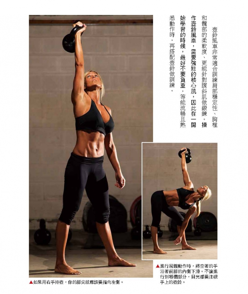 壺鈴風車非常適合訓練肩部穩定性、胸椎和髖部的柔軟度、更能針對腹斜肌做鍛鍊。操作壺鈴風車,需要強壯的核心肌,因此在一開始學習的時候,最好不要負重,等能流暢且熟悉動作時,再搭配壺鈴做訓練。