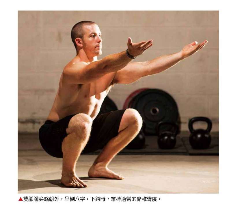 以舒適的站姿進行動作,雙腳間距與肩同寬,兩腳腳尖可略朝外、呈倒八字形。慢慢往下蹲,直到深蹲,過程中應維持適當的脊椎彎度,腳跟全程緊貼地面。接著,用臀部的肌肉力量, 起身回到起始姿勢。