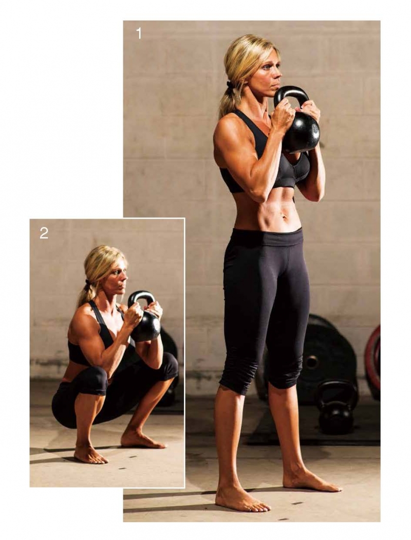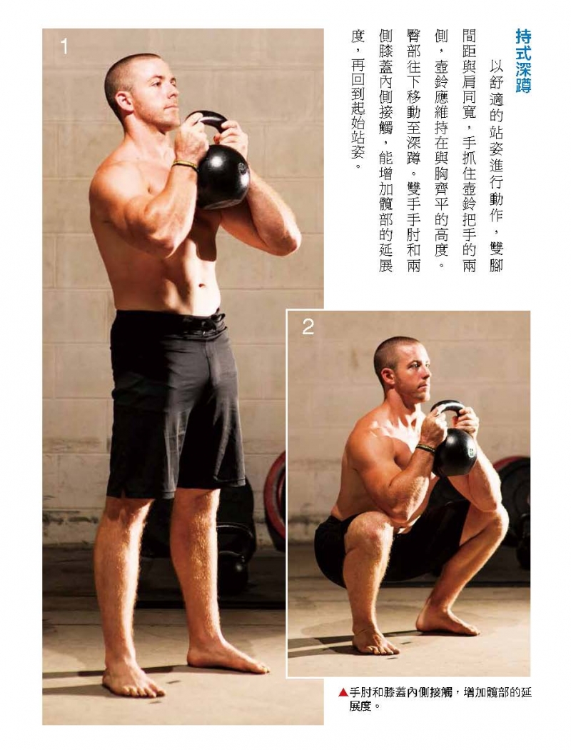 以舒適的站姿進行動作, 雙腳間距與肩同寬,手抓住壺鈴把手的兩側,壺鈴應維持在與胸齊平的高度。臀部往下移動至深蹲。雙手手肘和兩側膝蓋內側接觸,能增加髖部的延展度,再回到起始站姿。
