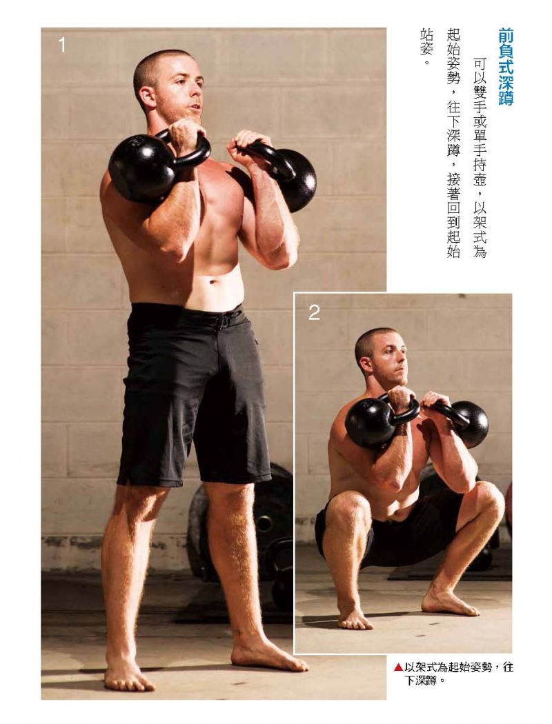 可以雙手或單手持壺,以架式為起始姿勢,往下深蹲,接著回到起始站姿。