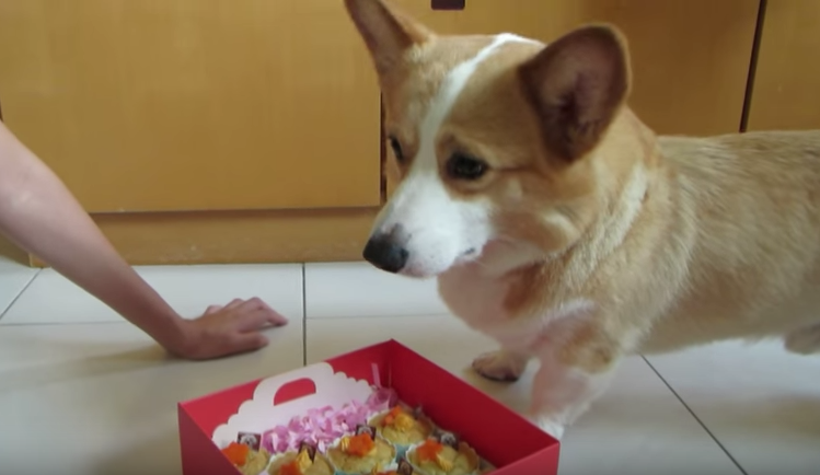 主人把兩盒點心放在地上,為家裡的柯基犬一一介紹後接著再問牠想吃哪個,結果狗狗選好後,主人又很調皮的阻止牠,不讓狗狗上前吃點心
