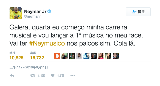「我們將會有『內音樂』了!到時候要分享哦!」他在自己的推特用葡萄牙文寫道。