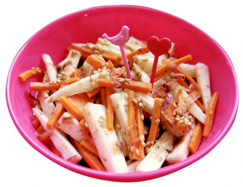2 放涼的紅蘿蔔絲與山藥一同放進同個容器中,淋上鰹魚露及芝麻香油,再撒上些許白芝麻即可(完成後可密封放冷藏,品嚐冰涼風味)。