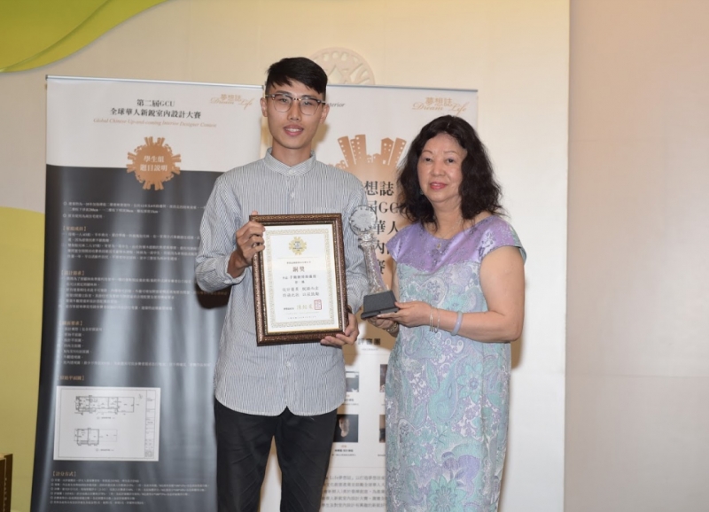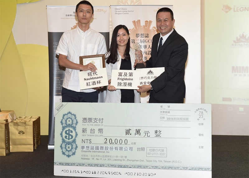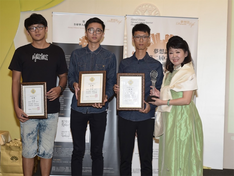 ↑↑↑由第二屆 GCU 全球華人新銳室內設計大賽主辦單位-夢想誌國際股份有限公司社長陳懿茱頒發本屆GCU金獎:樹德科技大學室內設計系-高彰孝、孫宇謙、甘哲宇的【迴】組,獲得3萬元獎金,1萬元獎品、獎座1只,出版個人電子書ㄧ本。