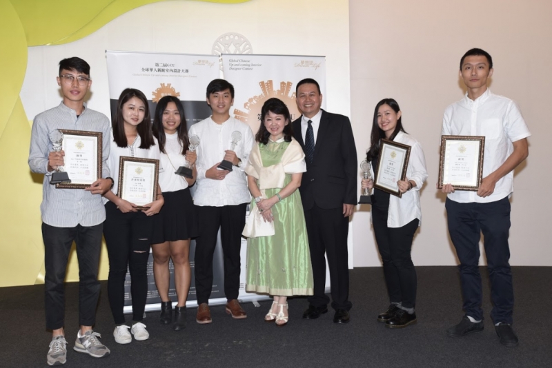↑↑↑夢想誌第二屆 GCU 全球華人新銳室內設計大賽頒獎典禮現場夢想誌社長陳懿茱、財團法人聖玄教育基金會董事長蔡文峯與金獎、銀獎、銅獎學生合影