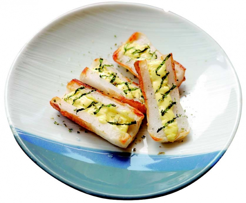 1 對切好的竹輪,在凹槽裡擠入適量的美乃滋,放入烤箱,以上下兩面烤約2 ~ 3 分鐘(時間可調整),讓表面呈現淡金色。