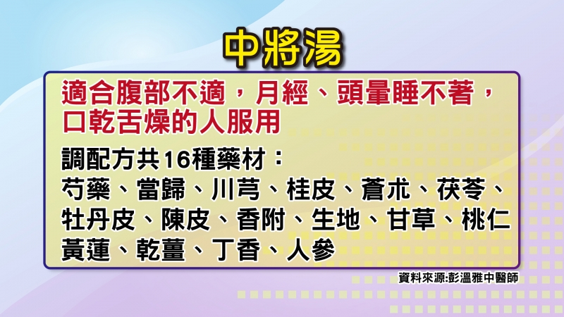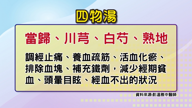 四物湯有補血的作用,男生也可以喝,中將湯適合更年期與經前不順者服用,沖泡方便,跟白鳳丸的效用相似,感冒、熬夜者不要喝,大出血、火氣大、高血壓都不適合喝四物,藥用四物是為病人調經止痛、養血疏筋,幫助病人活血化瘀,排除血塊,並減輕腹脹腹痛,使經血排出順暢;此外,四物湯更可補充鐵劑,減少月經來潮時的貧血、頭暈目眩及經血不出的狀況,不過,並不是每個病人都適用,尤其月經沒有瘀滯情況的人,千萬不能在月經來的時候喝,中將湯適合經期前喝,腹部不適,月經、頭暈、睡不著,口乾舌燥的人服用,另外,四物加上活血化瘀的桃仁、紅花而成的桃紅四物湯,臨床上便常用來治療子宮內膜異位等問題。