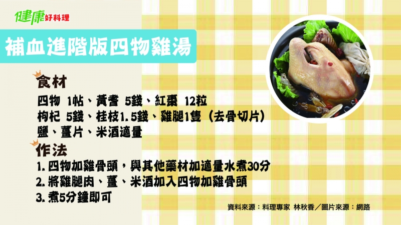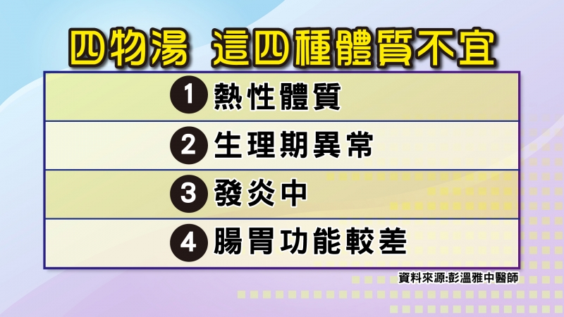 ❷生理期異常:有生理期異常的人應停止吃四物湯,找出原因後再食補。所謂的生理期異常包括經期提前、腹部脹痛、血塊多、顏色鮮紅等。