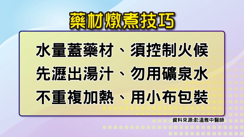 陶鍋適合拿來煮中藥,因其材質特性可讓煎煮過程中的溫度較恆定,且較不容易與藥材中的成分產生化學變化,而鐵、鋁、錫鍋更是不能用,以免金屬離子與藥物起交互作用,降低藥效。水量太多或太少都不好,加水蓋過藥材過約5公分即可,易發散的藥材如防風、薄荷等,應在轉文火時放入一起煮約30分鐘;燉補性補藥一開始就放,轉文火再煮約50分鐘,煎煮好的湯汁盡快瀝出,勿讓煮過藥材浸在湯汁中,避免吸收其有效成分。揮發性藥材只能燉煮1次;燉補性補藥則可燉煮2次,第2次水量是第一次的一半,煎煮中藥材時用自來水即可,不須使用礦泉水,因礦泉水的硬度較高,而中藥材中所含的礦物質可能因此和礦泉水出現取代作用,湯汁中反而得不到完整有效的成分,當次燉煮的中藥湯汁最好當次喝完,因重複加熱後有些揮發性、芳香性的成分會流失更多;細小的中藥材如五味子、礦石等,建議用小布包裝起來煮,避免沉著鍋底而燒焦,中藥材一旦燒焦幾乎就失去藥效,且清洗鍋爐時細碎的藥材也可因此避免堵塞排水口。