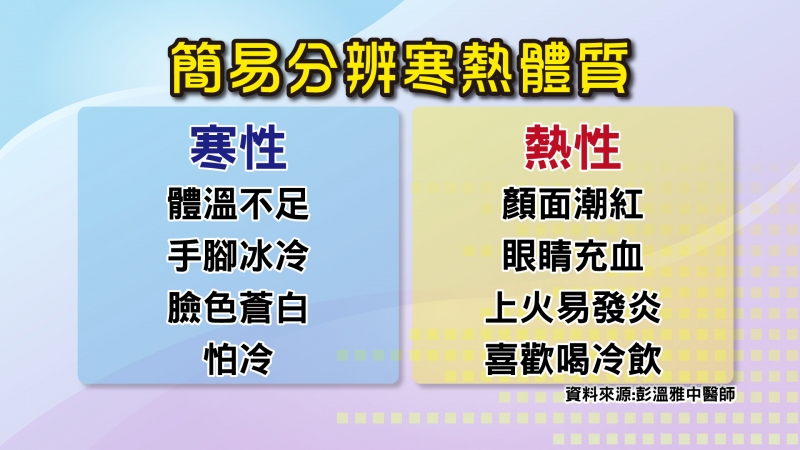 寒性體質的身體機能和代謝活動都較衰退,體溫不足、手腳冰冷、臉色蒼白、怕冷;熱性者則顏面潮紅、眼睛充血、身體上火易發炎、喜歡喝冷飲
