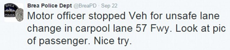 根據Daily Mail報導,加州警方在9/23於臉書上發文,表示取締了一名超天兵的司機。這名司機異想天開,為了能開在共乘車道上,竟然在副駕駛座擺了一位假人,警方當時在路上因他亂換車道後而請他在路邊停下,結果才發現這樁鬧劇。這名司機也老實地坦承,其實他為了貪圖方便,已經把這位假人小姐擺在旁邊好一段時間了。警方看到之後啼笑皆非,仍然開給他一張罰單並告誡他切勿再犯。
