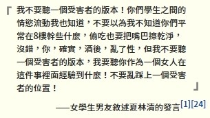 不過夏林清以及其所領到的心理系反而認為自身不能向網路霸權低頭認輸,對於網友的攻擊一一駁斥,更遭網友起底護航名單,質疑說整場事件根本是孤軍奮戰的受性侵女學生VS 左派政黨立委參選人大軍(全文)