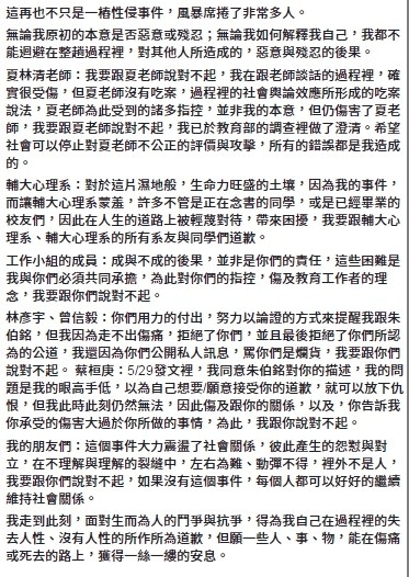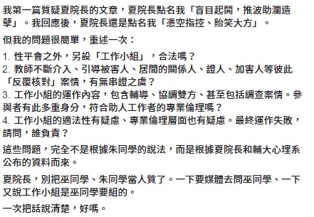 許多網路意見領袖紛紛質疑怎麼會是由受害人道歉?夏所領導的團隊也回應說巫是為不實言論傷害輔大心理系道歉,並非是一個性侵受害者的身分道歉,更反擊朱姓男友應該為對夏不實的抹黑出來面對。