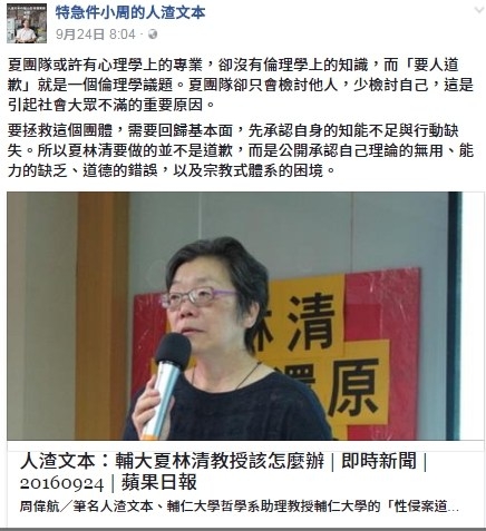 同為輔大同事的倫理學教師人渣文本則表示夏林清在操作的只是不斷賣弄自己的專業術語,將輔大心理系成為一個共同排外、個人崇拜的夏教。