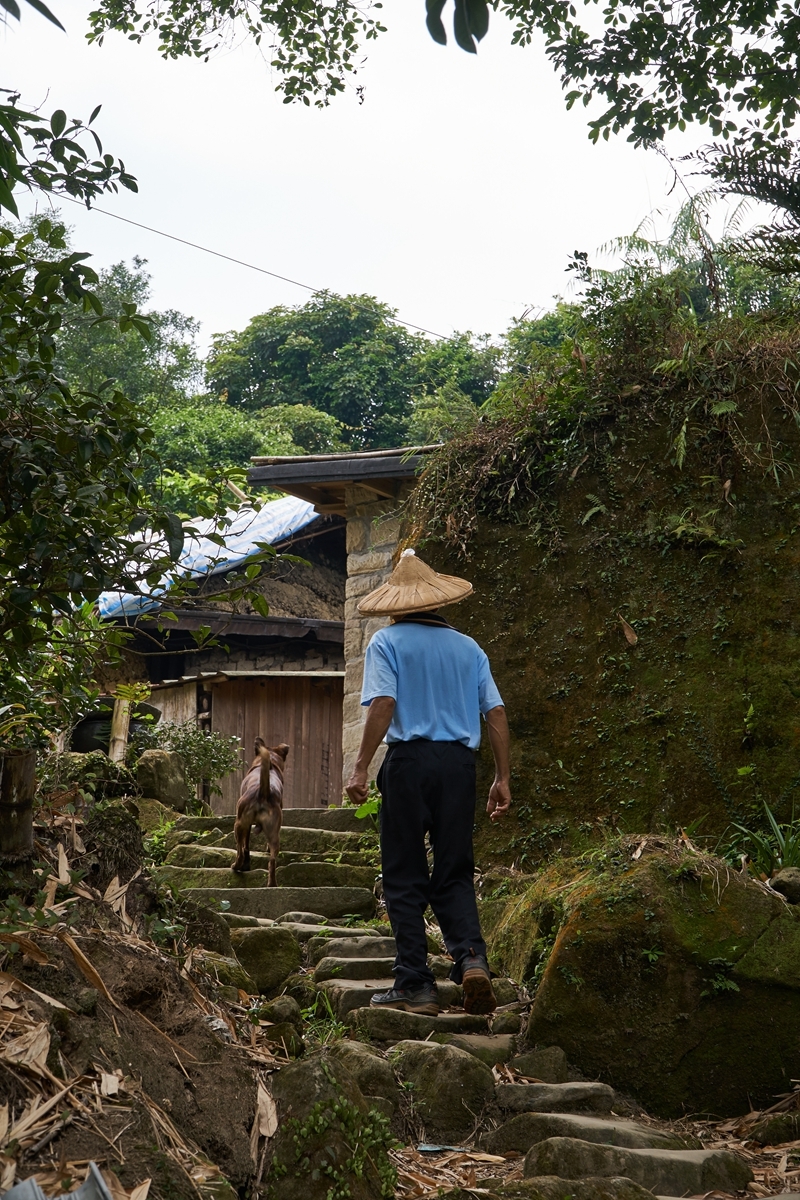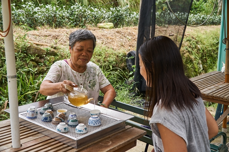 採訪當天,跟著阿公走進他在半山腰的茶園,他不穿鞋,扛著鋤頭赤腳走在茶園裡,即使駝背,仍勤勞地整理茶園、農田,不灑農藥,友善環境。種茶除了自己喝,也樂於和人分享,見山友爬上山滿頭大汗,就奉茶邀入門閒聊,阿嬤更是幽默風趣,總是逗得旅人哈哈大笑。