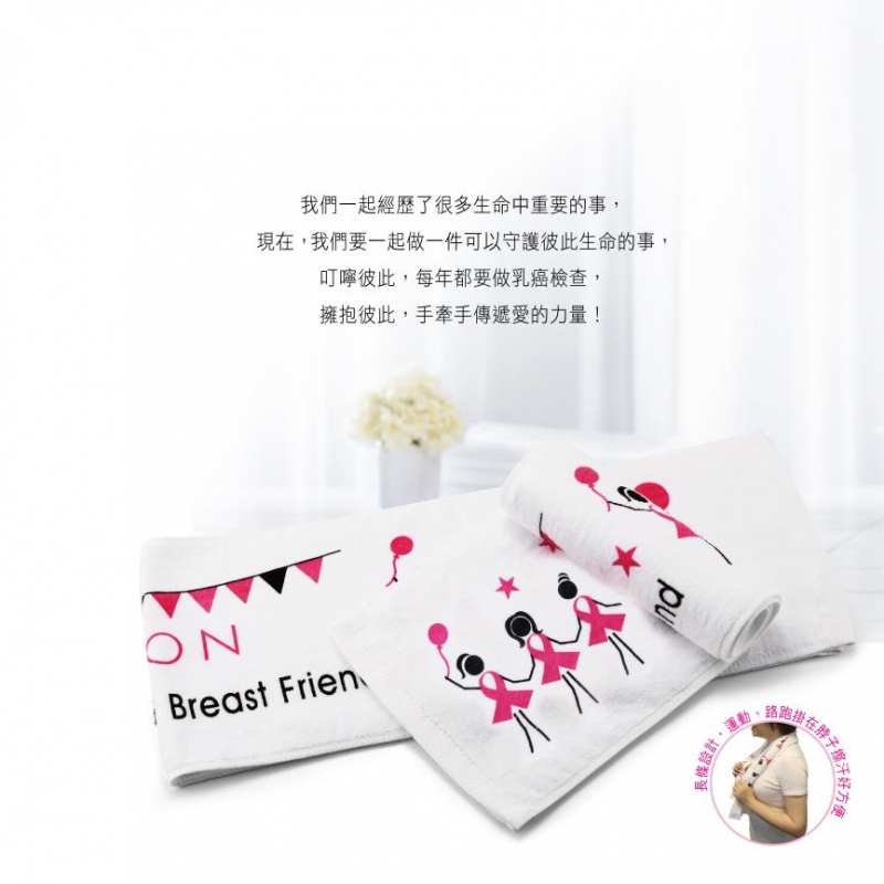 近代許多醫學報告指出,3至4成的癌症可透過飲食調整、運動與減重來預防,不健康的飲食習慣、缺乏運動和肥胖都與乳癌息息相關;此外,國人女性的運動量更是嚴重不足,而有21~25%乳癌的肇因就是運動不足所造成。 雅芳為鼓勵女性朋友「動起來」並讓自己更充滿健康和活力,推出【有妳真好毛巾組】義賣活動!配合今年閨蜜主題,毛巾設計搭配獨創的粉色絲帶姊妹塗鴉,傳達出姊妹淘關心彼此、手牽手傳遞愛的設計理念,象徵姊妹們最重要的承諾:「我們一起經歷了很多生命中重要的事情,現在,我們要一起做可以守護彼此生命的事!」。