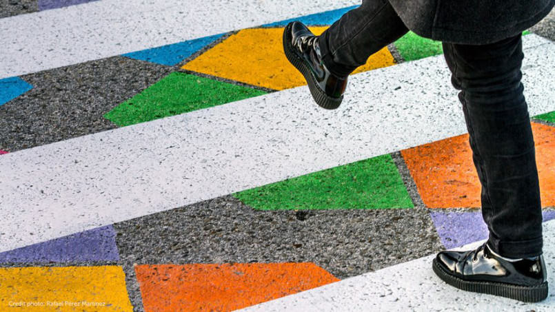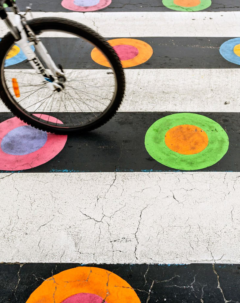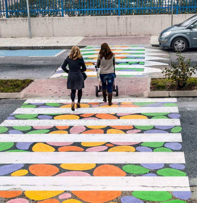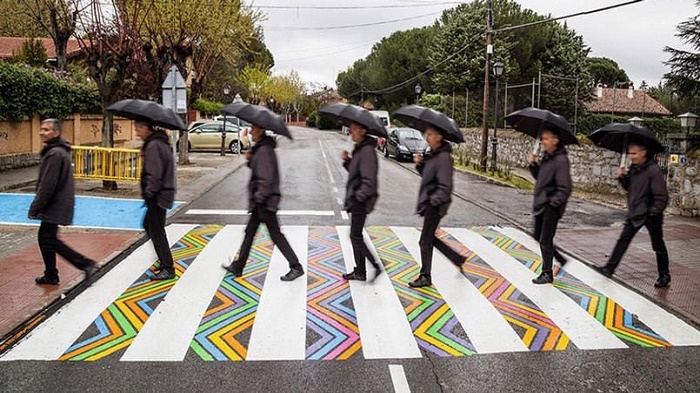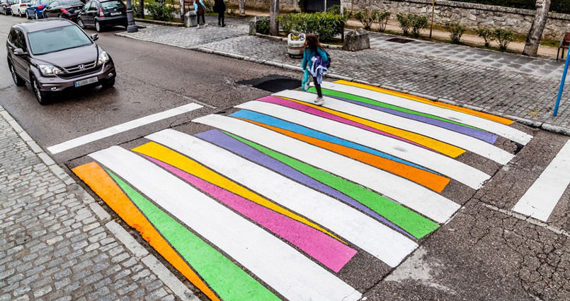 於是有位名為Christo Guelov的街頭藝術家,在斑馬線的白色線條之間,以七彩斑斕的顏色填充,加入不同的幾何圖案,正方形、橢圓形、三角形、不規則的線條等,不僅讓彩色斑馬線成為藝術作品,也提高了實用性,帶給司機和行人新的視覺印象,進而更注意馬路安全。