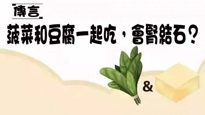 大家普遍認為菠菜和豆腐不能一起吃,因為菠菜中所含的草酸和豆腐中含有的鈣結合後會產生草酸鈣,會對人體產生副作用。事實上這兩種食物共食只是會影響鈣的吸收,但並不是兩種食物相剋。要解決這個問題也很簡單,因為菠菜中含有的草酸溶於水,只要把菠菜過熱水焯一下再和豆腐燉著吃就不存在任何問題了。